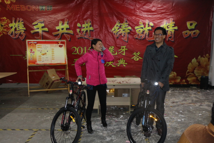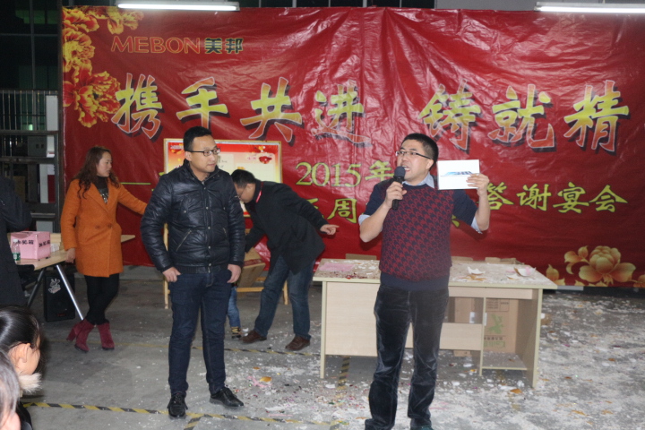 晚上6:00,公司2015年尾牙暨5周年答謝宴會(huì)在公司一樓大廳內(nèi)舉辦,宴會(huì)由生產(chǎn)副總黃光平主持, 80多人歡聚一堂,共話(huà)新年新希望??偨?jīng)理彭銳首先發(fā)表熱情洋溢的致辭;二是對(duì)功勛員工、先進(jìn)員工進(jìn)行頒獎(jiǎng),人均1000元,并頒發(fā)榮譽(yù)證書(shū);三是進(jìn)行員工喜聞樂(lè)見(jiàn)的博餅游戲,每桌博出了狀元、榜眼、探花、進(jìn)士、舉人、秀才,均有價(jià)值不等的獎(jiǎng)勵(lì)??倹Q賽博餅獲得者分別由外協(xié)吳富春、員工家屬?gòu)堺愺瞢@得,分別獲得獎(jiǎng)金888元。四是在砸金蛋環(huán)節(jié),由銷(xiāo)售部的閆建坤奪得,獎(jiǎng)品是價(jià)值3000元蘋(píng)果牌平板電腦;亞軍由技術(shù)部的田維亮、倉(cāng)管雷蘭芳分別獲得,獎(jiǎng)品均為價(jià)值1200元的山地自行車(chē);季軍由趙艷山、蘇金華、陳武和、盧真根、張華成分別獲得,均獲得豪華萬(wàn)向輪登機(jī)箱獎(jiǎng)品。期間,還穿插員工子女砸金蛋,獎(jiǎng)品有籃球、乒乓球拍、羽毛球拍等,錘錘有獎(jiǎng),皆大歡喜。