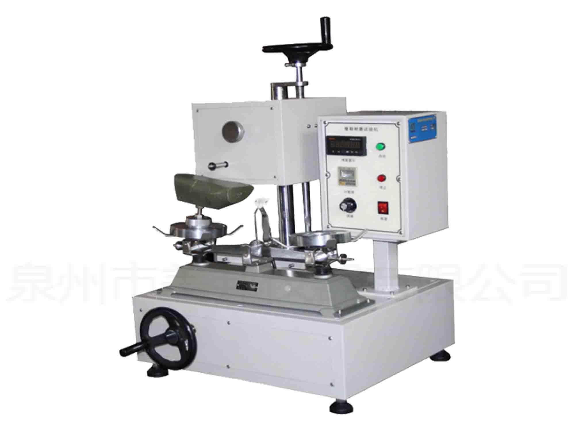 This machine is used to test the wear resistance of shoe sole and forming bottom (piece). The rotary grinding wheel is vertically pressed on the specimen and wear test is carried out at a certain load, speed and time to measure the wear mark length.